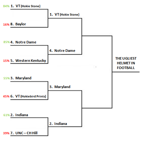 Round of 4The #1 and #4 seeds “won” easily and the candy stripped chrome of Indian topped the chrome of Chapel Hill. There was one close battle though, the chicken-footed Hokie atrocity nearly knocked out the Maryland state flag helmets. Instead the #3 Maryland flag helmet advances with a 55%-45% “victory” to face #2 Indiana (the candy stripe helmet is a reference to this). Meanwhile the kitchen backsplash Hokie Stone helmet faces Notre Dame’s two face look. This round is a much bigger toss up and voting is now open. Please vote and share this post on your social media accounts.