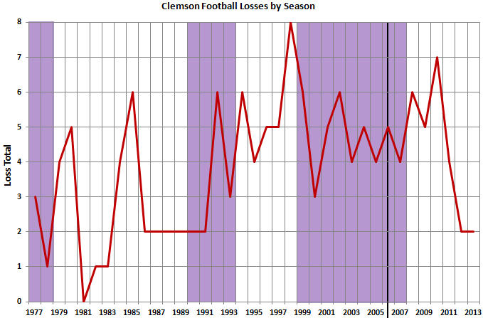 To look into the topic I’ve plotted wins by season dating back to the Charlie Pell era (the purple shading indicates the coaching era). The expansion to the 12-game schedule in 2006 makes it a little tricky. To account for that, I’ve also plotted total losses in a separate chart.