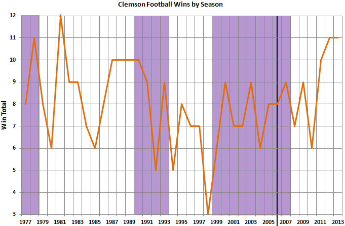 Danny Ford had an incredible seven seasons with two losses or less and stands head and shoulders above those who came after him. You can see the decline under Coach West, the rebuild and plateau under Bowden, and finally the return to prominence under Coach Swinney. Check it out and leave your thoughts in the comments. Click on the charts to enlarge.